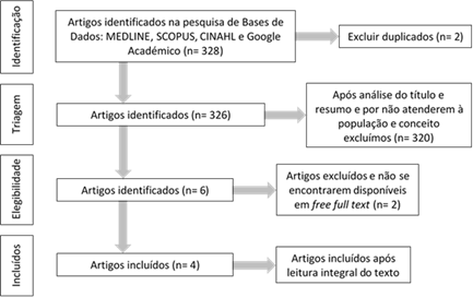Foram identificados 328 estudos nas diferentes bases de dados, excluído (n= 2) por ser duplicado. Pela análise do título e resumo, removidos (n= 288), após leitura na íntegra, foram desconsiderados devido à população em estudo (n= 8), conceito (n=24) e não se encontrarem disponíveis em free full text (n= 2). Foram incluídos 4 estudos.