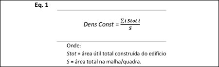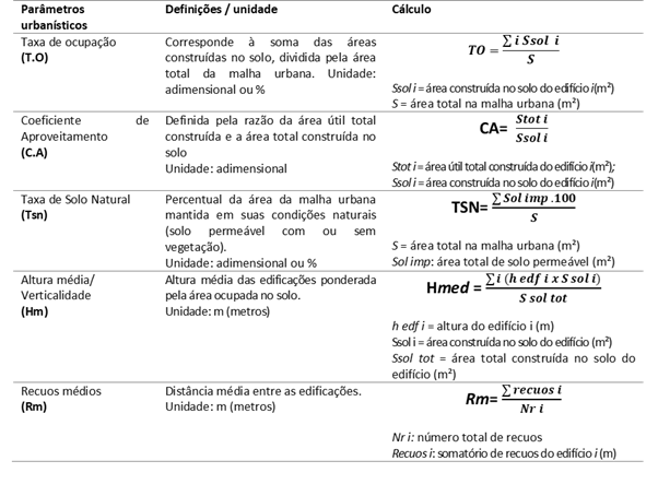 Tabela 3: Conceitos e equações adotadas para cálculo de parâmetros urbanísticos tradicionais
