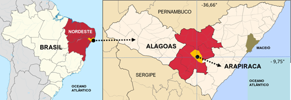 A cidade de Arapiraca está localizada no centro do estado de Alagoas, na mesorregião do agreste que corresponde à região de transição entre a costa úmida e o interior semiárido do nordeste brasileiro (IBGE, 2017). Encontra-se a 280m acima do nível do mar e a maior porção de seu território está situada em um planalto.