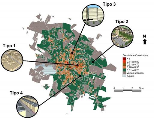 Foram selecionados tecidos urbanos mediante a análise da diversidade de formas de ocupação do solo predominantes na cidade de Arapiraca. Para subsidiar este procedimento, foi elaborado o mapa de densidades construtivas das quadras urbanas a partir dos dados do cadastro multifinalitário da prefeitura local, aplicados através do programa Terra View (Figura 2). A densidade construtiva corresponde à soma das áreas úteis construídas dividida pela área total da malha urbana (Eq.1).