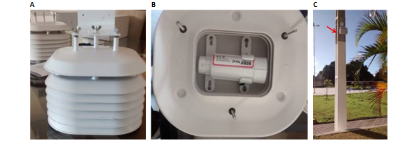 Foi realizado monitoramento microclimático nos tecidos selecionados para coleta de dados de temperatura e umidade relativa do ar, no período de 15/12/2015 a 10/01/2016 (período quente e seco) utilizando-se data-loggers da ONSET do tipo HOBO Pro v2 (referência U23-001) que é um coletor de dados para ambientes externos à prova d'água (Figura 3). Os instrumentos foram calibrados uma semana antes do início do monitoramento microclimático. Os sensores apresentam faixa de operação correspondente a -40°C a 70°C para registro de temperatura do ar, e de 0 a 100% para registro de umidade relativa do ar, com precisão correspondente a ± 0,21°C (a partir de 0°C a 50°C) e, para umidade relativa do ar, ± 2,5% (a partir de 10% a 90% típica).