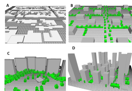 Figura 4:  Exemplos de cenários modelados no ENVI-met com diferentes índices de densidade arbórea.