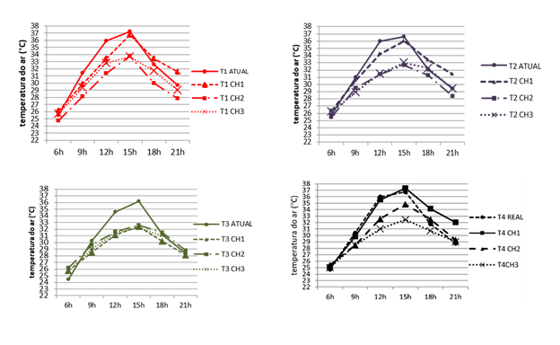Figura 5:  Gráficos referentes aos resultados das simulações computacionais no modelo ENVI-met: comportamento da temperatura do ar