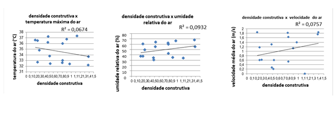 A identificação do coeficiente de determinação (R²) entre as variáveis ambientais e os dados de densidade construtiva dos cenários estudados, foi realizada a partir da elaboração dos gráficos de dispersão (Figura 7). Os dados foram correlacionados através da análise de regressão linear sendo destacada a alta dispersão e a fraca correlação com todas as variáveis ambientais analisadas (baixos coeficientes de determinação-R²). Como exemplo, no caso da temperatura do ar, o coeficiente de determinação (R²) foi igual a 0,0674, significando que 6,74% da variação da temperatura podem ser explicados pela relação entre esta variável e a densidade construtiva e que os 93,26% restantes de variação são classificadas como não explicada, em razão de outros fatores.