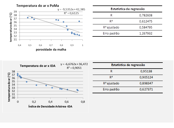 Foi verificada a correlação negativa entre o comportamento da temperatura máxima do ar (variável dependente) e os parâmetros urbanísticos avançados como porosidade da malha e o índice de densidade arbórea (variáveis independentes), através de coeficiente de correlação com valores absolutos acima de 0,7.
