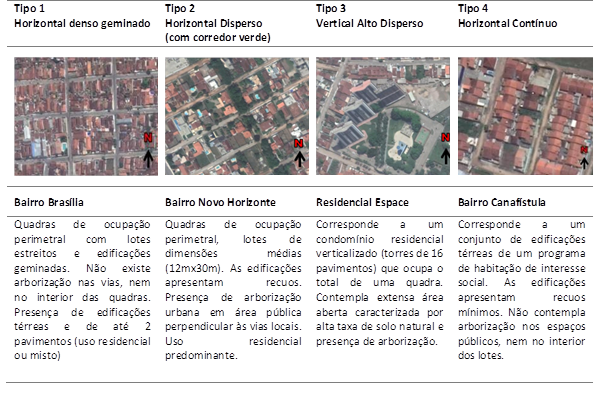 Foram identificados quatro tipos morfológicos de tecidos urbanos em Arapiraca-AL, determinados por diferentes padrões de ocupação do solo, com altitudes aproximadas, e uniformidade nos padrões construtivos (Tabela 2).