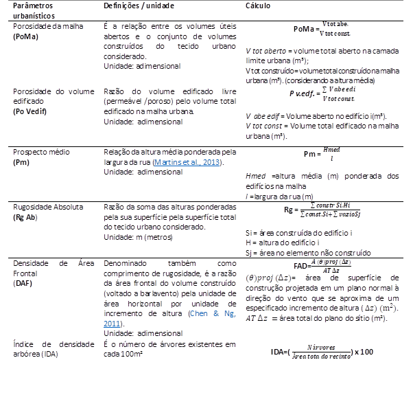 Além da quantificação dos parâmetros urbanísticos tradicionais, foram calculados, também, os parâmetros urbanísticos avançados que correspondem a indicadores de desempenho ambiental definidos a partir de atributos bioclimatizantes, conforme conceitos e equações apresentadas no Tabela 4. A classificação morfológica dos tecidos selecionados foi realizada segundo Martins et al. (2013).