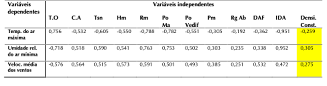 Correlação positiva moderada com a taxa de ocupação do solo, ou seja, quanto maior a taxa de ocupação do solo do recinto urbano, maior será a probabilidade de aumento da temperatura do ar no nível microclimático;