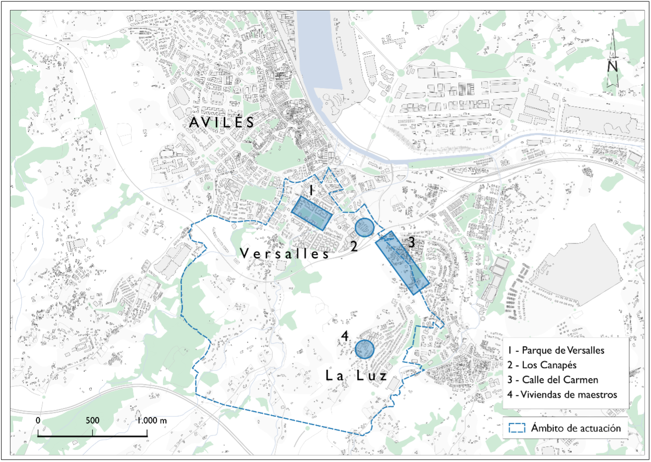 Avilés presentó su estrategia titulada “Rejuvenecimiento Ciudad” a la primera convocatoria, resultando una de las seleccionadas. El documento fue elaborado por una consultora externa. La estrategia delimita, a partir de la agrupación de varias secciones censales, su ámbito de actuación en dos barrios situados en su periferia sur, Versalles y La Luz, incluidos dentro del análisis de Áreas urbanas con riesgo de exclusión social (Ayuntamiento de Avilés, 2016). Entre las líneas de actuación presentadas se encuentran varias que conllevan transformaciones urbanas como son: la remodelación del parque de Versalles, la reurbanización de las calles del Carmen y de la Paz, el acondicionamiento del entorno de Los Canapés, monumento histórico situado entre ambos barrios y se incluyen también líneas estratégicas encaminadas a la elaboración de un plan de movilidad urbana sostenible (PMUS), entre otros proyectos de marcado carácter social.