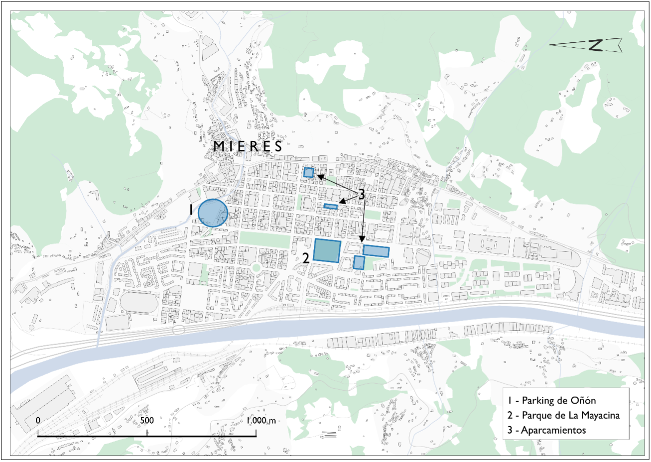 Así pues, dentro de los cerca de cinco millones de euros destinados a la EDUSI de Mieres, las principales actuaciones de transformación urbana han sido la construcción del parque de La Mayacina, dotado de una partida presupuestaria de 1.150.000 €, que se suma al aparcamiento de Oñón cuyo presupuesto se dota de 241.883,83 € y el denominado sistema de nuevas centralidades, establecido a partir de la recualificación de espacios públicos y que conlleva la urbanización de aparcamientos en superficie en las calle Dolores Ibárruri, La Pista y Manuel Llaneza y que cuenta con una cantidad de 375.500 € (Ayuntamiento de Mieres, 2016).