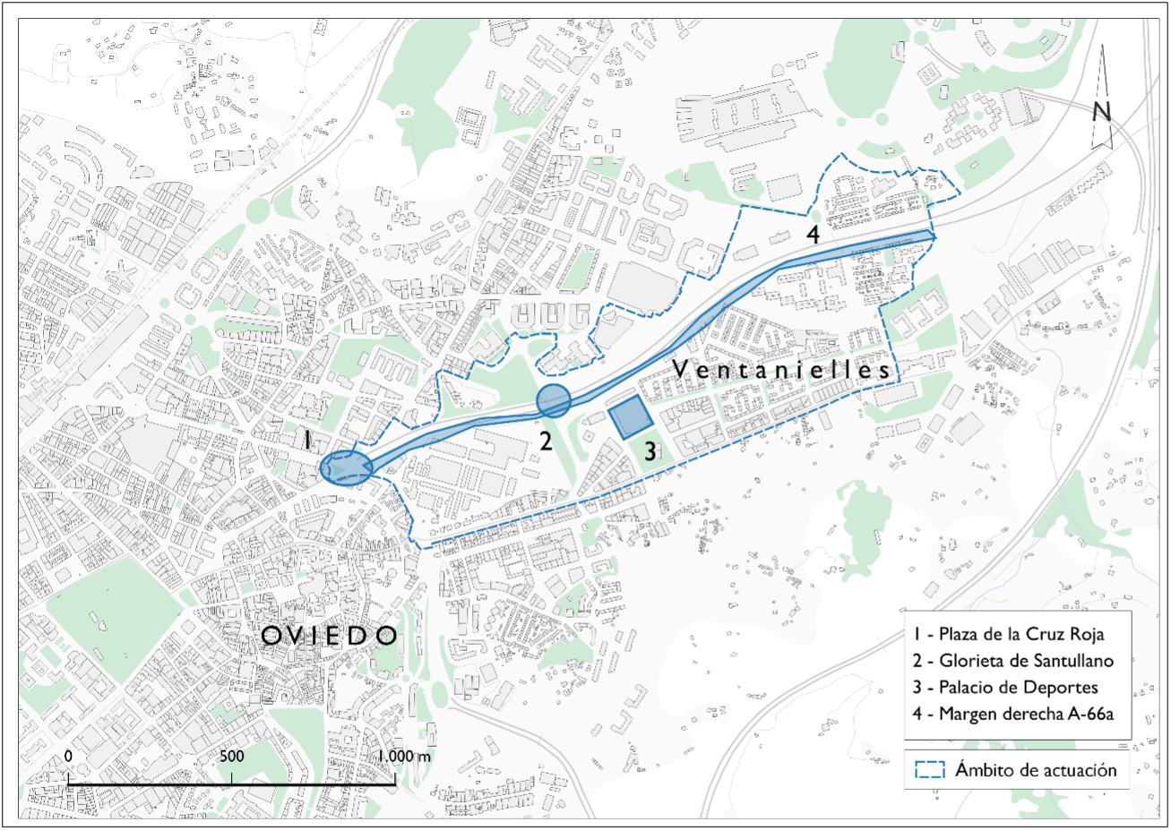 Tras haberse presentado a la primera convocatoria, en la que la capital asturiana no fue seleccionada, Oviedo obtuvo finalmente 10.308.120 € de financiación europea en la segunda convocatoria. La estrategia del Ayuntamiento de Oviedo (2016) se titula “Conectando Oviedo” y tiene como objetivo la regeneración urbana de un ámbito de actuación delimitado a lo largo de un tramo de la autovía A-66a, cuyo trazado se introduce en la trama urbana del este de la ciudad. Este ámbito encierra el único barrio de la ciudad que se encuentra en el catálogo de barrios vulnerables (Hernández Aja et al., 2018). Como señala Carrero de Roa (2018), tanto el espacio acotado, como el objetivo de la propia estrategia, son el resultado de la participación ciudadana que procura satisfacer las demandas vecinales para la transformación de la autovía en un vial urbano dotado de equipamientos, servicios y zonas verdes, que al mismo tiempo aleje el tráfico de la iglesia de San Julián de los Prados y que mejore la calidad de vida de los vecinos afectados por el actual volumen de tráfico, tanto por su contaminación acústica, como ambiental y por el efecto barrera que constituye entre las diferentes piezas de la ciudad.