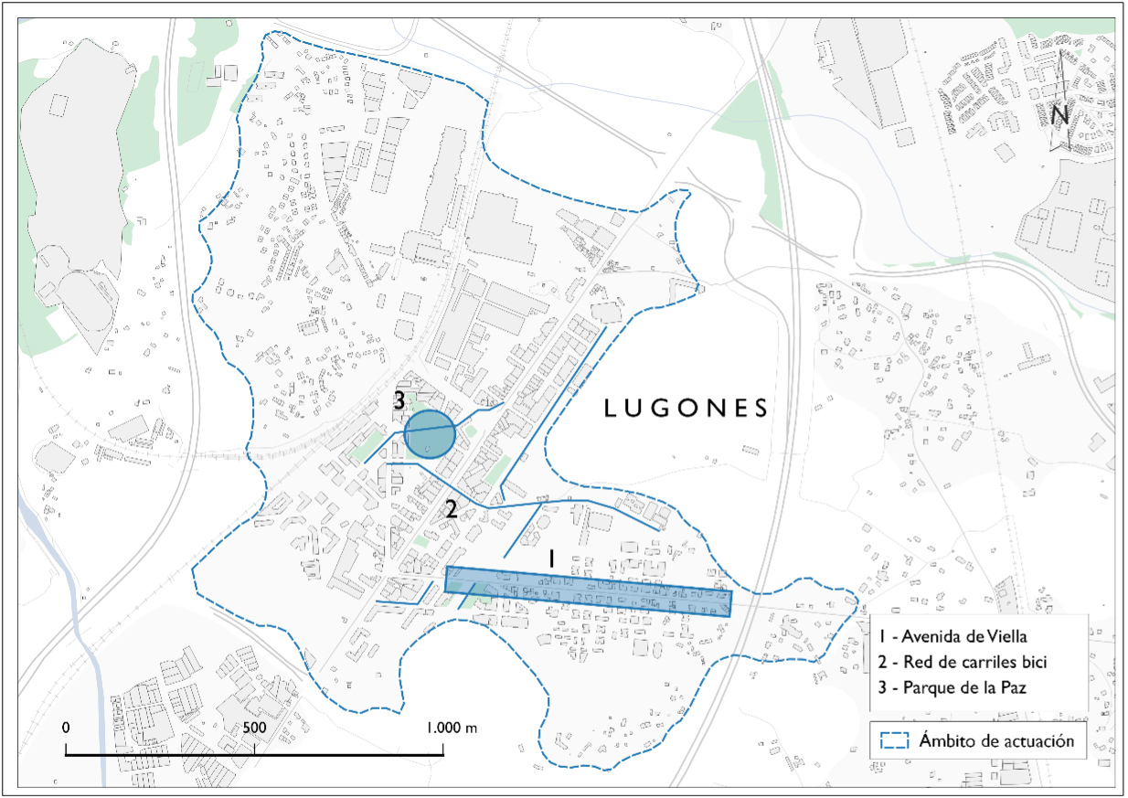 El municipio cuenta con varios núcleos de población y en la estrategia presentada por el Ayuntamiento de Siero (2016) se ha limitado el ámbito de actuación a la localidad de Lugones, de 13.094 habitantes, Lugones, a escasos metros del municipio de Oviedo, está situada dentro de áreas de influencia de la capital y además, este núcleo de población se caracteriza por su alta accesibilidad gracias a una densa red de infraestructuras, lo que a su vez ocasiona un notable flujo de tráfico y problemas derivados de la contaminación atmosférica. Por todo ello, el Ayuntamiento de Siero ha centrado sus esfuerzos en la mejora de la movilidad sostenible y la reintroducción de espacios verdes y corredores naturales, así como en la regeneración urbana de ciertos espacios como el parque de La Paz y la Avenida de Viella, una vía periurbana que se caracteriza por su morfología más próxima a una carretera que a una calle y con la que se quiere conseguir una mejor ordenación del espacio.