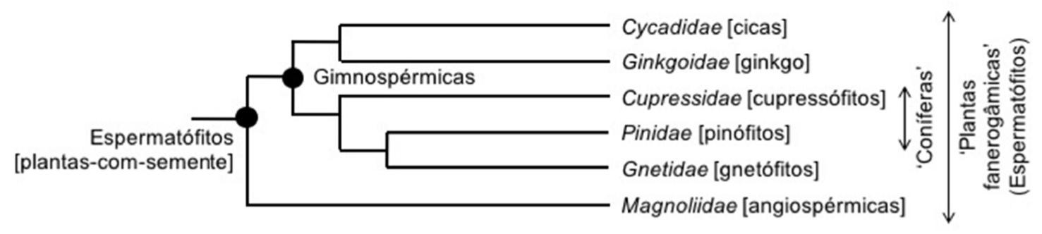 Das inúmeras linhagens de plantas-com-semente que povoaram o planeta entre o Devónico e o final do Mesozoico sobreviveram até ao presente apenas seis (relações evolutivas resumidas na Figura 1). As angiospérmicas (plantas-com-flor), de todas a mais recente, é dominante na grande maioria dos ecossistemas terrestres, com aproximadamente 352.000 espécies conhecidas, mais 10-20% por descrever (Joppa, Roberts, & Pimm, 2011). No âmbito das gimnospérmicas - plantas-com-semente sem flor - reconhecem-se cinco grandes linhagens, que em conjunto perfazem apenas cerca de 1.000 espécies (Christenhusz et al., 2011). As gimnospérmicas incluem as cicas, os ginkgófitos - uma linhagem monoespecífica representada pelo ginkgo (Ginkgo biloba) -, os pinófitos (pinheiros, abetos e afins), os cupressófitos (ciprestes e outras espécies), e os gnetófitos, com apenas 3 géneros, Gnetum, Ephedra e Welwitschia, e cerca de 30 espécies. Os pinófitos e os cupressófitos constituem as coníferas, um grupo provavelmente parafilético (não inclui todos os descendentes de um ancestral comum).