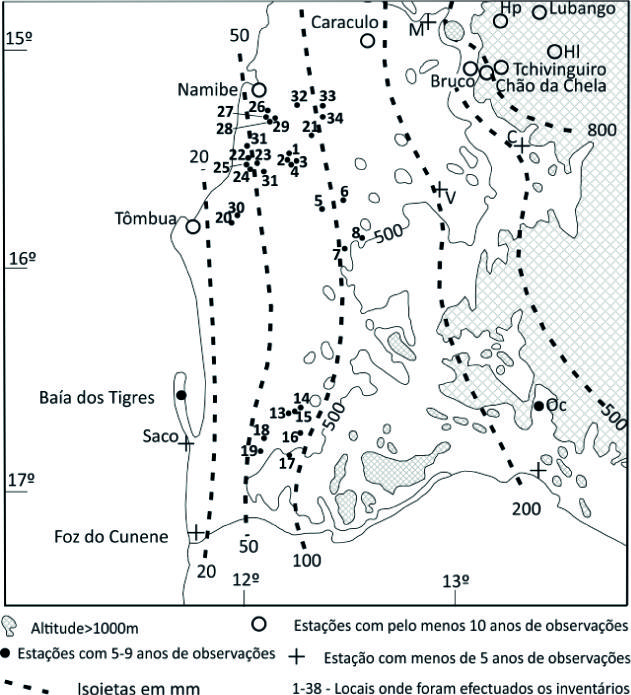 Do ponto de vista climático, na área estudada as isoietas estão compreendidas entre os 20 e os 100 mm (média 1914-1969) (Daveau, 1972; Dinis, 1991) sendo que a faixa litoral entre Tômbua e a Foz do Cunene não ultrapassa os 20 mm anuais (Daveau, 1972) (Figura 3). As temperaturas mais elevadas registam-se durante o período das chuvas (janeiro a abril). Os valores baixos de precipitação estão relacionados com a estabilização das massas de ar oceânicas arrefecidas pela baixa temperatura das águas marítimas da corrente de Benguela o que leva, contudo, à enorme frequência de nevoeiros que este deserto litoral regista. Estes nevoeiros penetram, em determinadas situações, cerca de 100 km para o interior (Amaral, 1973). É conhecida, e tem sido estudada, a importância destes nevoeiros no fornecimento de água e na sobrevivência dos vegetais do deserto do Namibe (Hachfeld & Jurgens, 2000). Devido à influência da corrente fria de Benguela, os valores da temperatura da água do mar oscilam entre 16°C e apenas em fevereiro, março e abril podem superar os 20°C, chegando a atingir os 25°C (Silveira, 1969). Desta forma, mesmo durante o período quente e chuvoso, as temperaturas do ar nunca são muito elevadas tendo em conta a latitude do território estudado (Amaral, 1973) - a temperatura média anual situa-se entre os 19 e 23°C na área de estudo (Dinis, 1991). Quanto à classificação de Köppen, a área de estudo apresenta um clima de tipo BWh-clima árido, desértico quente (Griffiths, 1972; Schulze, 1947).