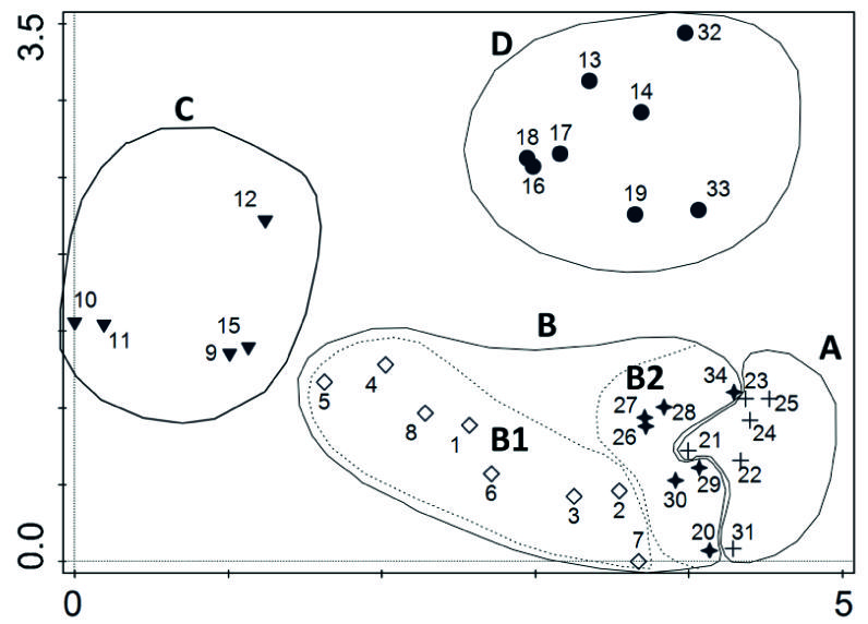 Figura 4 Análise de correspondências retificada (DCA - Detrended correspondence analysis) obtida com o programa CANOCO V.5.0 (Ter Braak & Šmilauer 2012) dos inventários de comunidades de W. mirabilis realizados no deserto do Namibe (Angola). A - Welwitschietum mirabilis Cardoso e J.C. Costa inéd; B -Welwitschio mirabilis-Acacietum reficiens Cardoso e J.C. Costa inéd, (B1 facies com Boscia pestalozziana); C - Comunidade de W. mirabilis dominada por espécies do género Commiphora spp.; D - Comunidade de W. mirabilis dominada por Stipagrostis hochstetteriana var. secalina. (os inventários de 1-34 estão localizados na figura 3)
