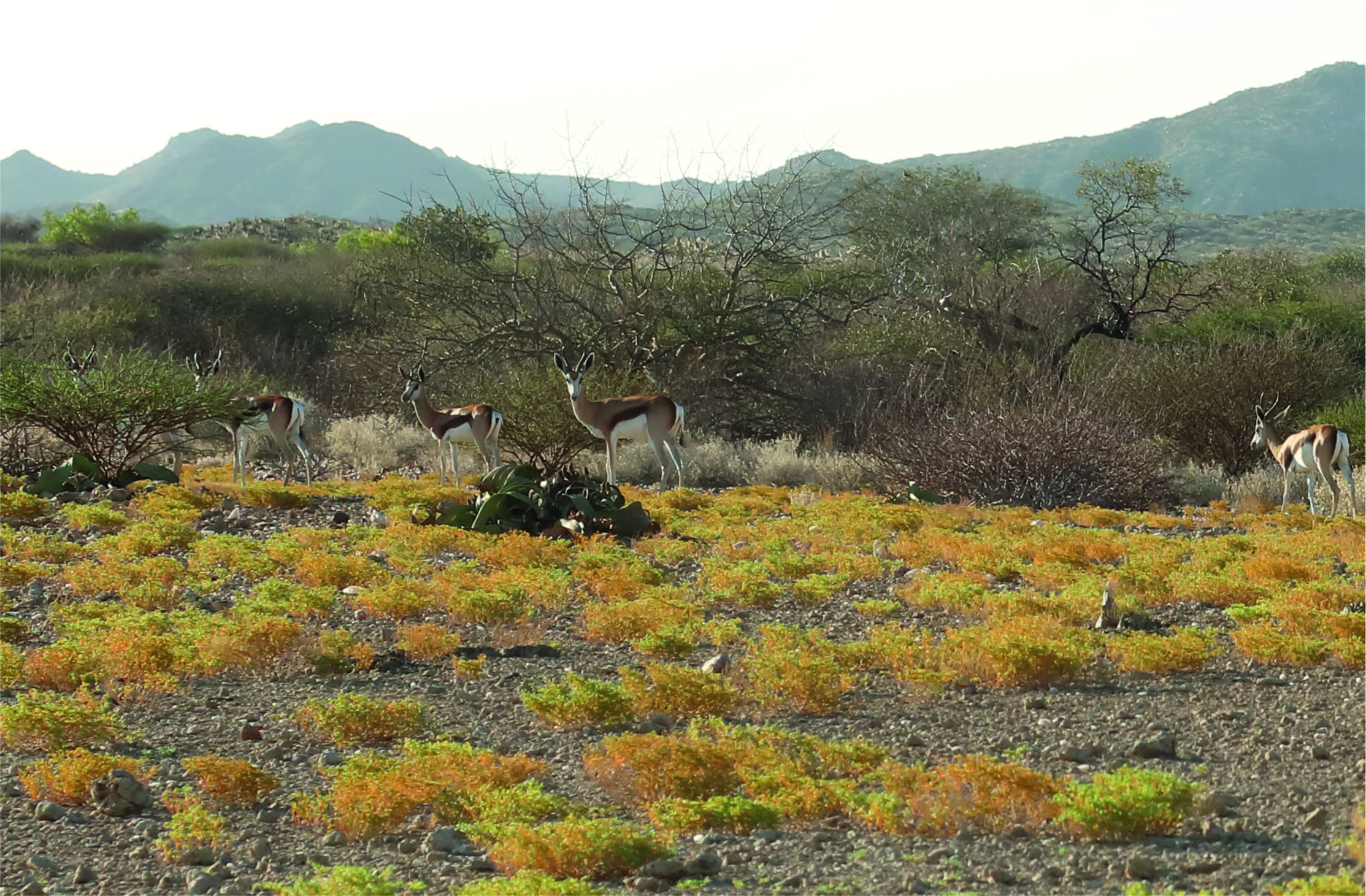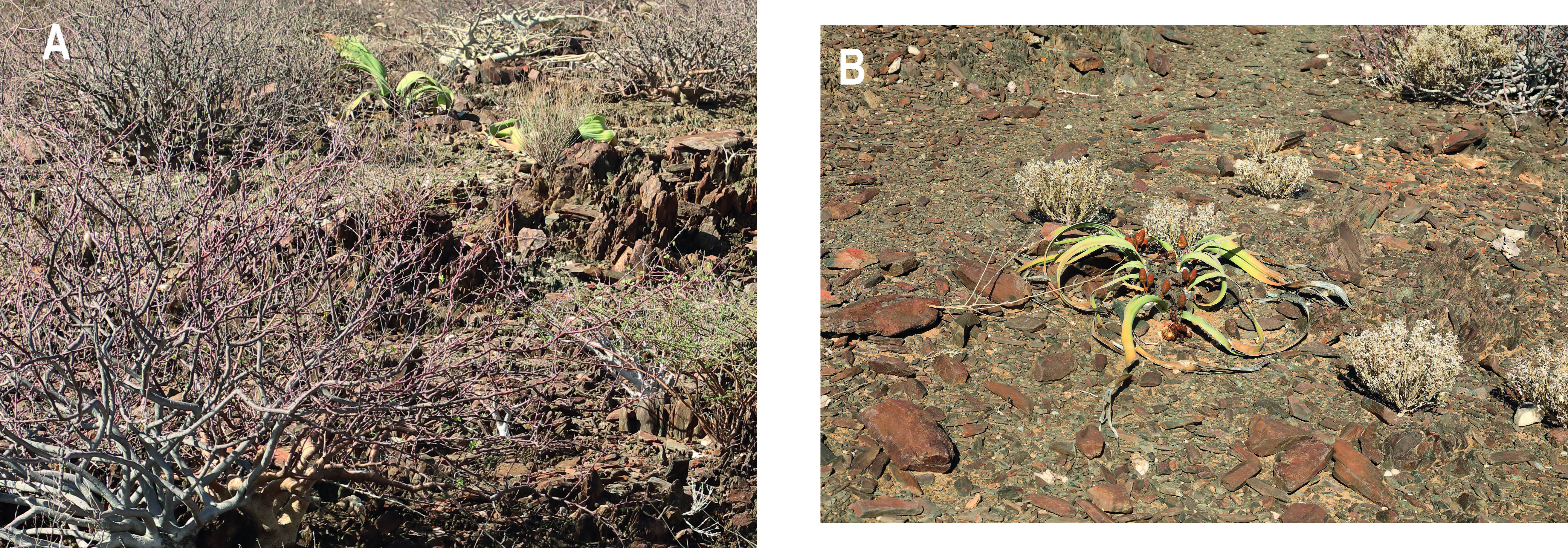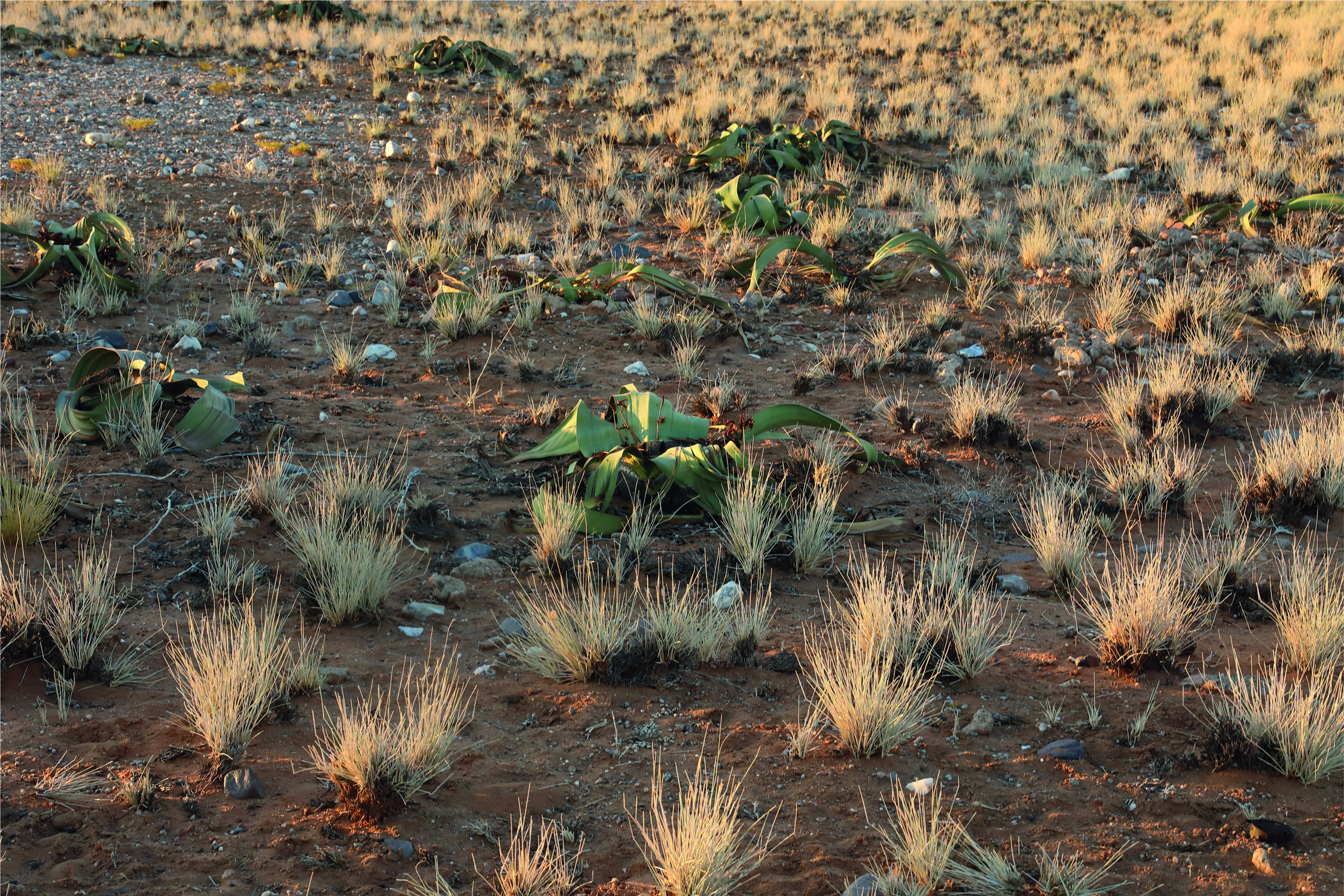 Comunidade descrita por Cardoso (2015) própria dos piedmont plain das áreas mais a norte do Deserto do Namibe angolano. Em ambientes mais extremos - de baixa precipitação ou em depósitos arenosos espessos - a W. mirabilis é a única planta perene dispondo-se em mosaico com comunidades paucispecíficas de plantas anuais dominadas por Zygophyllum simplex (figura 5). Estas são as áreas mais secas das superfícies sedimentares que cobrem as depressões entre os inselbergs preenchidas por leques aluviais, topograficamente sempre em posição mais elevada (interflúvios) do que as comunidades de W. mirabilis e A. recifiens que colonizam os valeiros de fundo plano definidos pelos cursos de água efémeros. Os sedimentos são, aparentemente, pouco espessos de modo a permitir o enraizamento da W. mirabilis nas plataformas rochosas subjacentes da superfície fundamental.