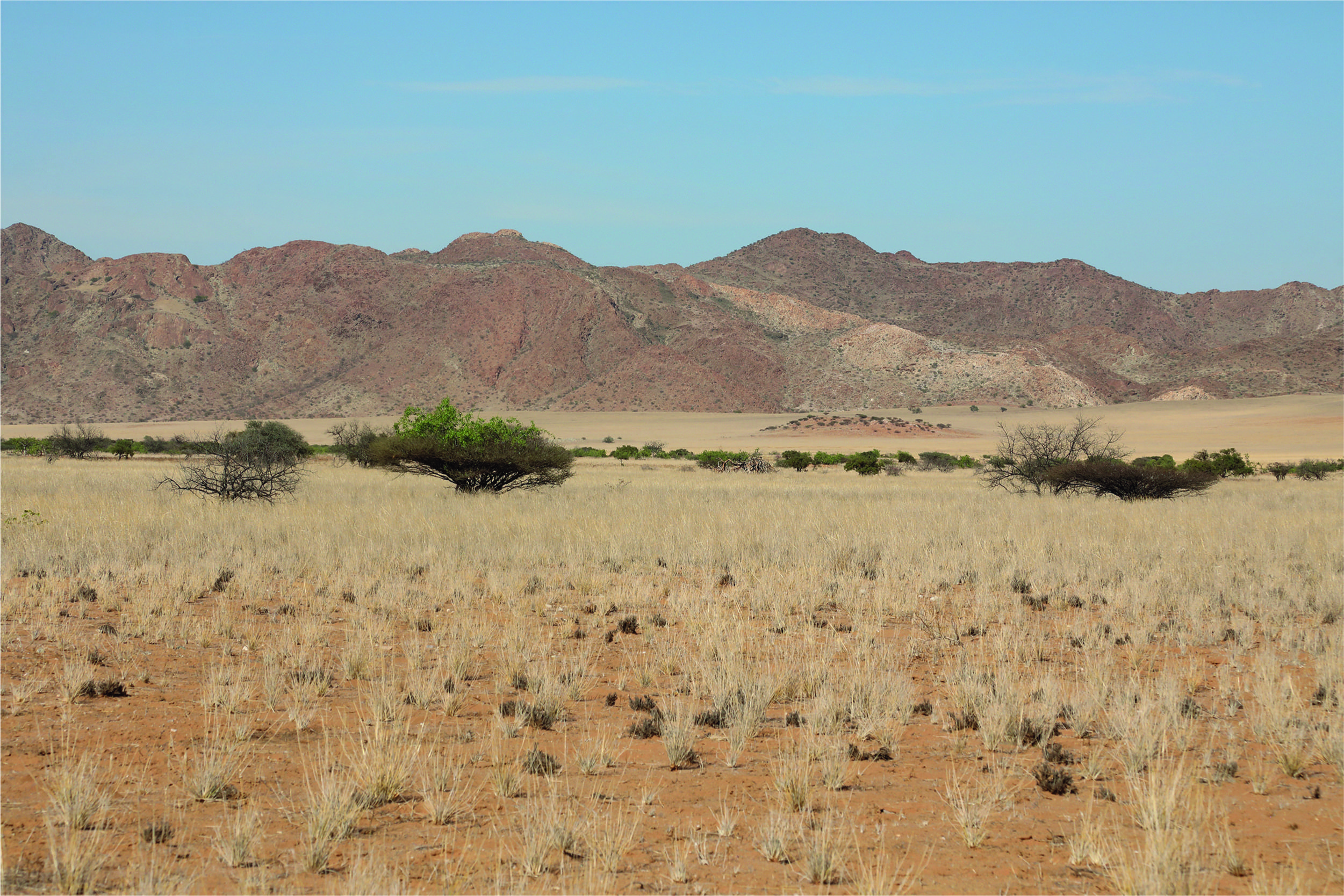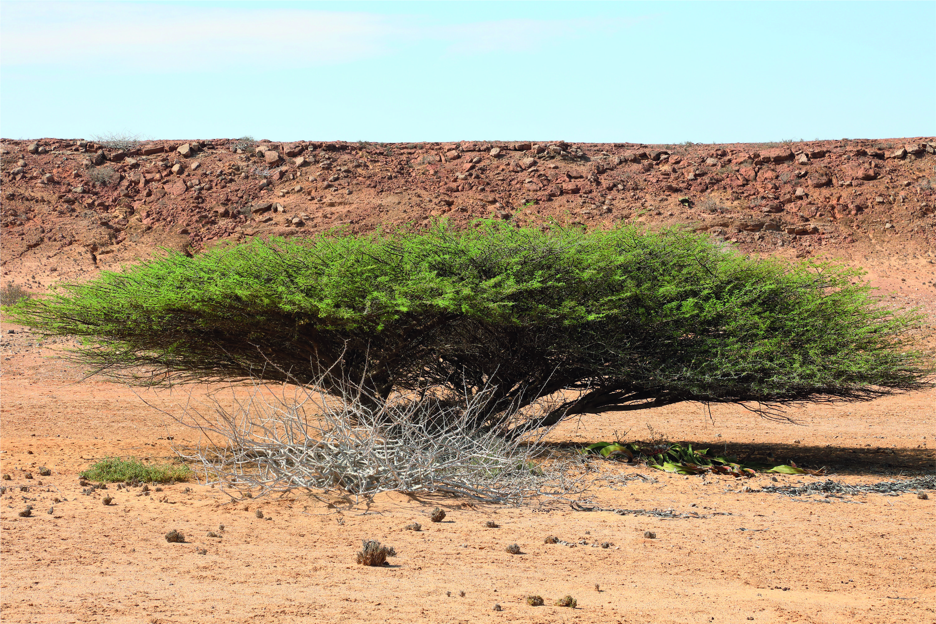 Figura 6 Alinhamento de espinheiras (A. reficiens) com W. mirabilis (Welwitschio mirabilis-Acacietum reficiens Cardoso e J.C. Costa inéd.) nos cursos de água efémeros das planícies sedimentares resultantes dos leques aluviais que transportam os sedimentos a partir dos inselbergs (ao fundo na imagem). Espinheira (Parque Nacional do Iona).