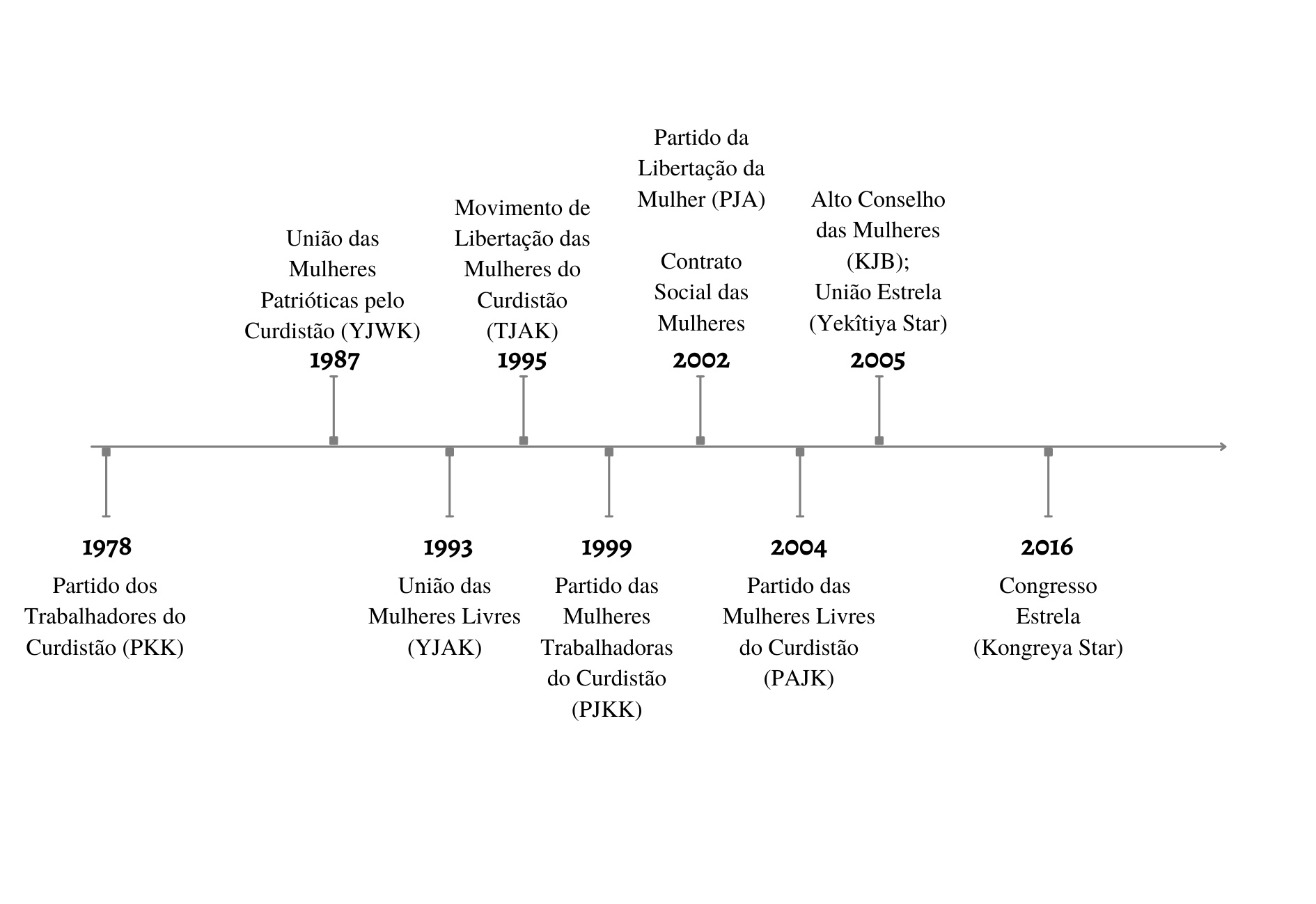 Indo além das estruturas partidárias, foi fundado o Alto Conselho das Mulheres (KJB, na sigla original) em abril de 2005, uma instituição guarda-chuva que tem como objetivo a formação de uma unidade confederada nas quatro partes do Curdistão, incluindo as diversas organizações de mulheres do PKK, como as unidades de autodefesa, as assembleias, as associações autônomas, etc. A partir de 2014, essa organização passou a compor a Comunidade das Mulheres Curdas (KJK, na sigla original), unificando as diferentes articulações de mulheres da região.3 Como vimos, o movimento de mulheres curdas se estrutura a partir de uma ampla rede de organizações. Assim, existe por exemplo a YJAK que, para além de estar voltada para a organização social e política das mulheres, desenvolve um intenso trabalho enquanto braço de autodefesa e proteção militar e, também, estruturas como o Partido das Mulheres Livres do Curdistão (PAJK, na sigla original), que atua fundamentalmente no campo ideológico. Uma síntese temporal da criação das organizações pode ser vista na Figura 1.