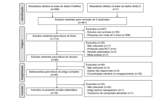 Os estudos foram selecionados em quatro etapas, como mostra o fluxograma detalhado na Figura 1: identificação, triagem, elegibilidade e inclusão. Na fase de identificação foram encontrados 463 estudos. Foram eliminadas apenas duas duplicatas. Na fase de triagem, foram eliminados estudos com animais, revisões sistemáticas, meta-aná- lises, e pesquisas realizadas há mais de cinco anos. Os critérios de elegibilidade foram definidos antes da realização da pesquisa e também estão exibidos na Figura 1. Ainda na triagem, após a leitura dos títulos, foram eliminados estudos não relevantes e protocolos para ensaios clínicos randomizados. Na etapa de elegibilidade, foram lidos os resumos e eliminados os estudos não relevantes, os que não apresentaram dados disponíveis sobre perda de peso ou sobre a terapia cognitivo-comportamental, e os estudos cujos pacientes apresentavam comorbidades que interferiam na perda de peso dos pacientes. Ainda na etapa de elegibilidade, a análise da metodologia e dos resultados de cada estudo permitiu que fossem eliminados