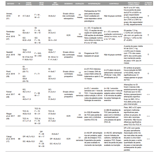 A presente revisão sistemática teve como objetivo geral avaliar a TCC como coadjuvante da terapêutica nutricional no processo de emagrecimento.