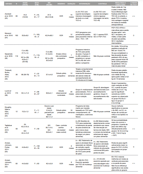 Mas, apesar dessas limitações que envolvem a metodologia de alguns estudos, um ponto forte desta revisão sistemática é seu procedimento metodológico baseado nas diretrizes propostas pelo PRISMA (21). Outros pontos positivos são o foco em uma abordagem terapêutica de amplo conhecimento e aceitação, a TCC, e os diversos períodos de tratamento, incluindo longa duração, e amostras populacionais compostas por mulheres e homens com obesidade severa e a avaliação de fatores cognitivos na perda e manutenção do peso (17).