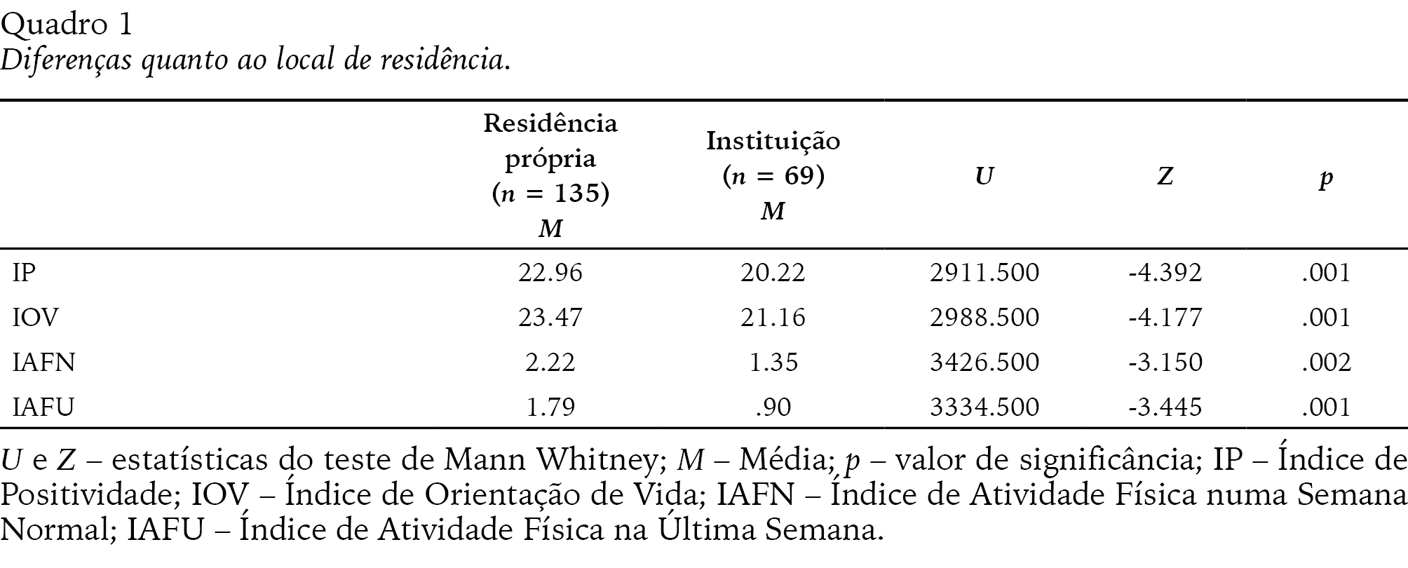 Após a utilização do teste de Mann-Whitney, verificou-se que o local de residência (Quadro 1) influencia significativamente a Positividade (Z = − 4.392; p = .001), a Orientação de Vida (Z = − 4.177; p = .001) e os índices de Atividade Física numa Semana Normal (Z = − 3.150; p = .002) e na Última Semana (Z = − 3.445; p = .001). Obtendo-se valores superiores para os indivíduos que vivem em residência própria.