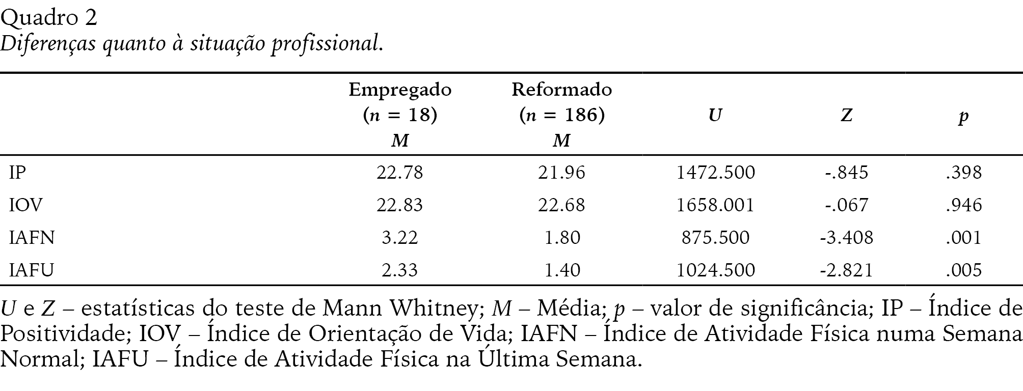 Verificou-se que a situação profissional (Quadro 2) influencia significativamente o IAFN (Z = − 3.408; p = .001) e o índice de Atividade Física na Última Semana (Z = − 2.821; p = .005). Verificando-se valores superiores para os indivíduos reformados.