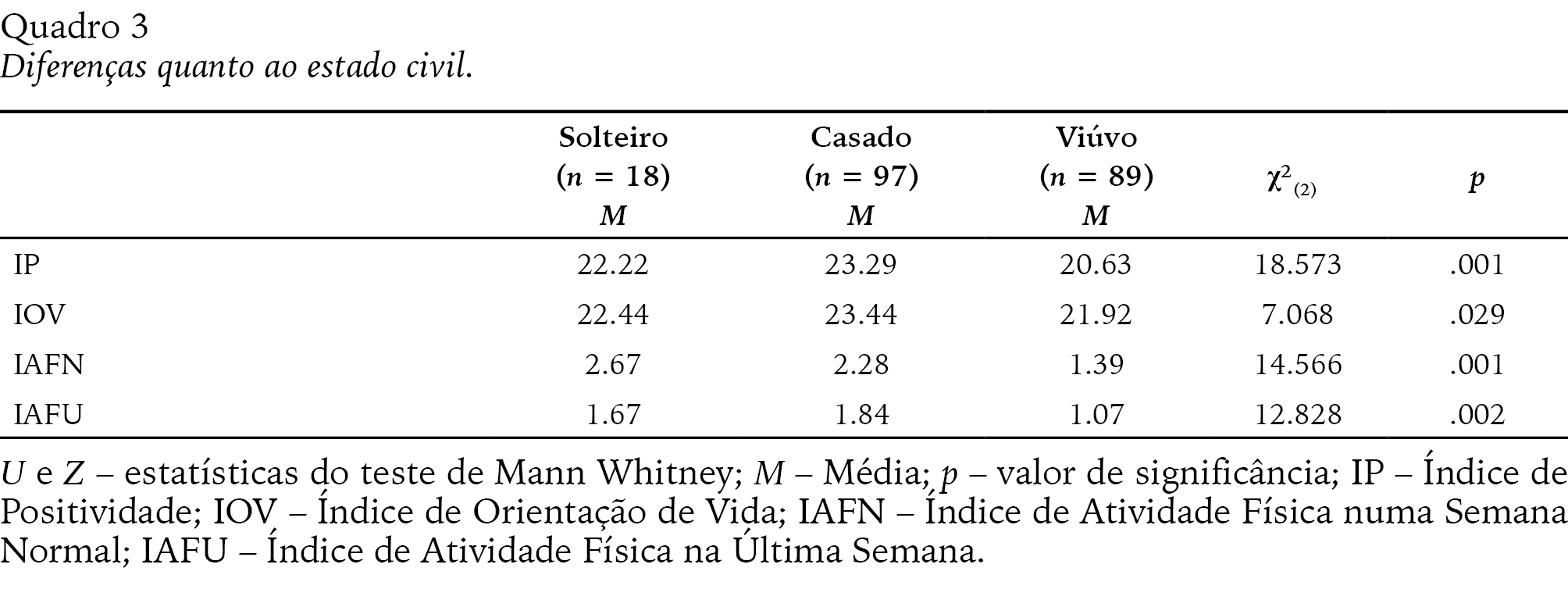 Quanto ao estado civil verificou-se que este influencia significativamente todas as variáveis. Na análise comparativa realizada quanto ao estado civil verificaram-se diferenças significativas entre os casados e os viúvos relativamente aos índices de Positividade (t = 37.188; p = .001), Orientação de Vida (t = 22.284; p = .029), Atividade Física numa Semana Normal (t = 29.190; p = .002) e Atividade Física na Última Semana (t = 29.713; p = .001).