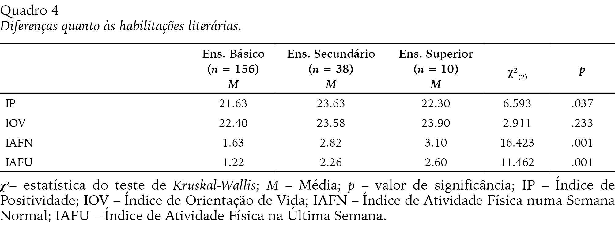Quanto às habilitações literárias verificaram-se diferenças significativas no IP ((2 (2) = 6.593; p = .037), IAFN ((2 (2) = 16.423; p = .001) e no índice de Atividade Física na Última Semana ((2 (2) = 11,462; p = .001). Os testes de comparações múltiplas realizados permitem verificar diferenças significativas entre idosos com ensino básico e ensino superior (t = − 27,277; p = .031) na variável IP, IAFN (t = − 50.099; p = .024) e índice de Atividade Física na Última Semana (t = − 27.913; p = .020). As médias mais baixas foram obtidas nos indivíduos com o menor nível de escolaridade e as mais altas foram: IP - Ensino secundário (23.63), No ensino Superior foi no IOV (23.90), IAFN (3.10) e IAFU (2.60).