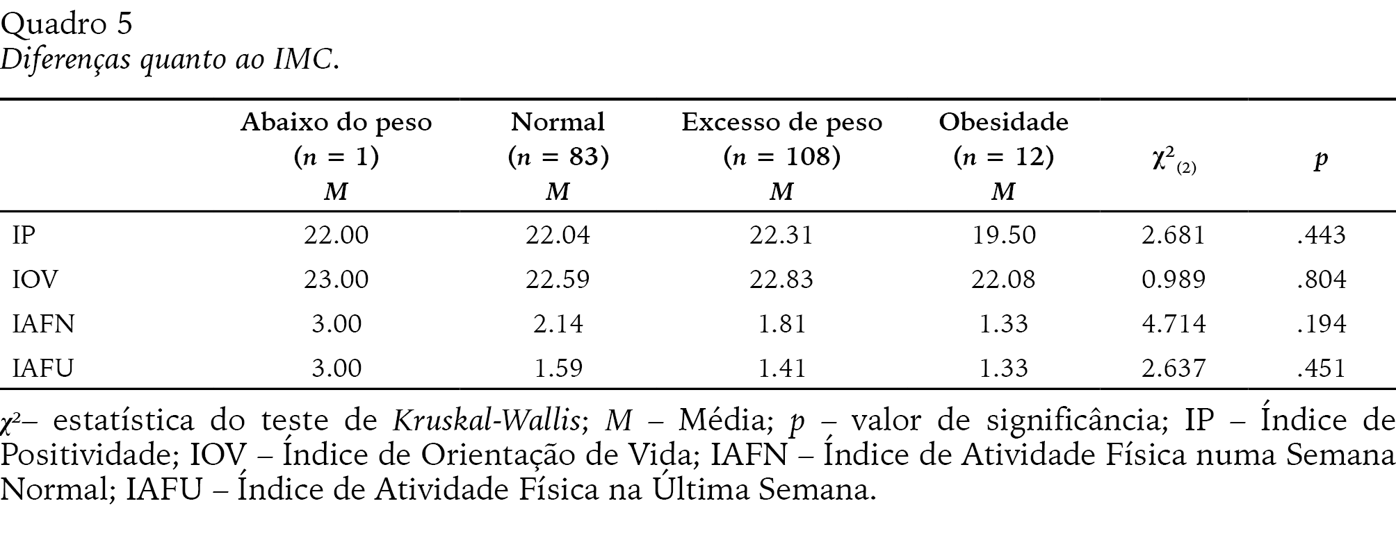 Relativamente ao índice de Atividade Física na Última Semana, também se verificaram diferenças significativas na Positividade ((2 (3)= 44.129; p = .001) e na Orientação de Vida ((2 (3) = 43.846; p = .001). As médias mais baixas foram obtidas no grupo dos que não praticavam e no caso do IP foi entre os que praticam duas a três vezes por semana, assim na variável IOV. As médias mais altas foram, no caso do IP nos que praticam 2 a 3 vezes por semana e nos que praticam mais de 3 vezes no caso do IOV.