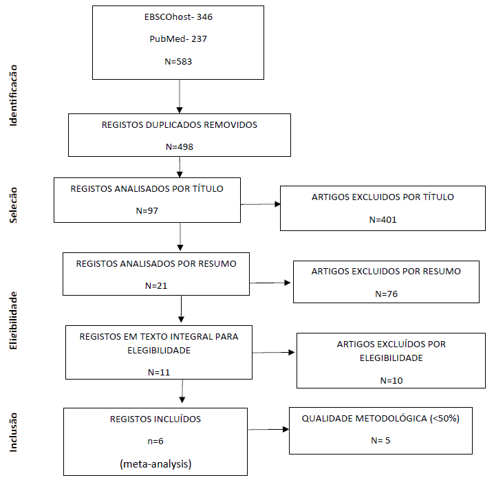 O EndNote foi o software usado para a gestão dos resultados que surgiram da pesquisa. O processo de inclusão dos artigos contemplou as seguintes etapas: identificação, seleção, elegibilidade e inclusão recorrendo ao diagrama PRISMA (Moher et al., 2009). A análise da figura 1 permite identificar 583 resultados. Foram eliminados 85 artigos duplicados tendo ficado com 498 artigos, destes, 401 foram excluídos após leitura dos títulos, ficando com 97. A análise dos resumos conduziu à exclusão de 76 artigos. Dos 21 artigos selecionados após leitura dos resumos 10 foram excluídos por não cumprirem os critérios de elegibilidade. Dos 11 artigos avaliados para leitura do texto integral, 5 foram excluídos por baixa qualidade metodológica (< 50 %) após aplicação da ferramenta de analise de qualidade metodológica e 6 foram considerados para integrarem esta revisão.
