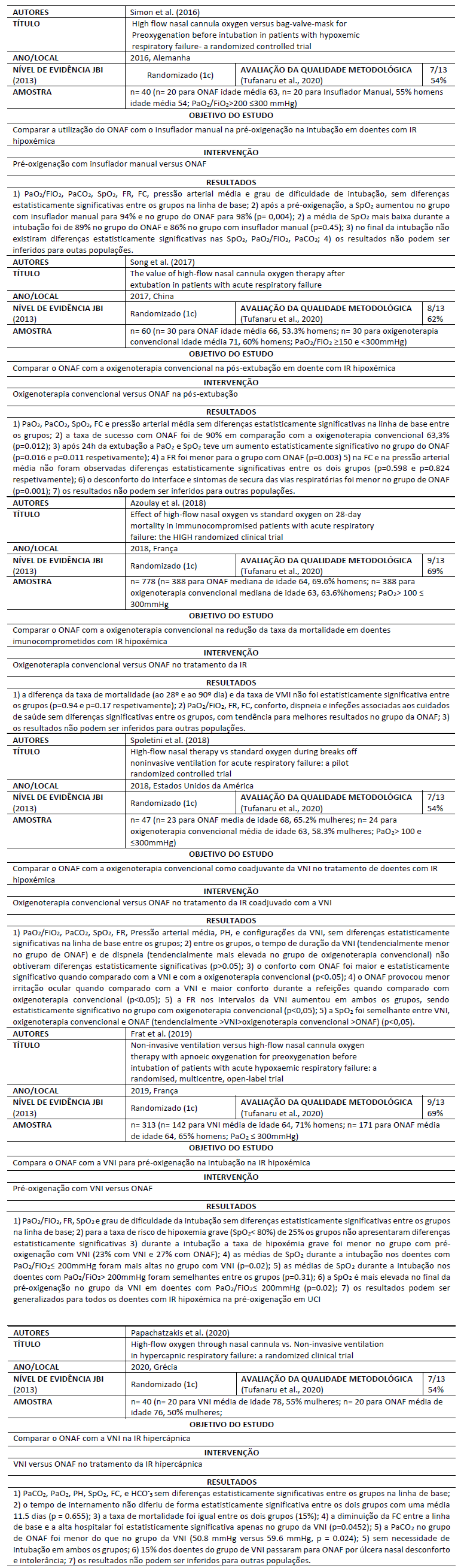 Os artigos que integram esta revisão são maioritariamente europeus, um é da China e outro dos Estados Unidos, tendo o ano de publicação variado entre 2016 e 2020. Nos estudos selecionados foi possível verificar uma homogeneidade em todos as amostras e entre os grupos em análise. A qualidade metodológica variou entre 54% e 69% após a aplicação da ferramenta de análise de qualidade metodológica. Esta baixa qualidade metodológica representa maior probabilidade de se poderem produzir resultados menos confiáveis, dificultando a sua replicação, por baixa validade interna e externa. Todos estes estudos se centraram na investigação da efetividade do ONAF no tratamento do doente com IR hipoxémica e/ou hipercápnica, comparando o ONAF com o insuflador manual e com a VNI na pré-oxigenação da intubação, o ONAF com oxigenoterapia convencional em três situações distintas: no doente imunocomprometido; na pós-extubação; como coadjuvante da VNI e o último estudo efetua uma comparação do ONAF com a VNI em doentes com IR hipercápnica. Os estudos de Simon et al. (2016) e Frat et al. (2019) debruçaram-se sobre a aplicabilidade do ONAF na pré-oxigenação na intubação em detrimento do insuflador manual e da VNI. A pré-oxigenação usando ONAF na intubação é viável e segura em comparação com o insuflador manual em doentes com IR hipoxémica com PaO2/FiO2> 200 ≤300 mmHg, comprovada por uma evidência estatisticamente significativa na SpO2. Porém, estes valores não são suficientemente robustos para privilegiar a escolha do ONAF em detrimento do insuflador manual, uma vez que no final da intubação não existiram diferenças estatisticamente significativas nos valores médios de SpO2, PaO2/FiO2 e PaCO2 (Simon et al., 2016). A segurança e a viabilidade do ONAF na pré-oxigenação de doentes hipoxémicos com PaO2/FiO2> 200 ≤300 mmHg, é também sustentada pelo trabalho de Frat et al. (2019) que demonstrou que as médias da SpO2 não revelaram diferenças estatisticamente significativas quando comparadas às do grupo da VNI na pré-oxigenação. Contudo neste estudo a VNI revelou ser melhor para prevenir a hipoxémia grave em detrimento do ONAF. Esta vantagem apenas foi estatisticamente significativa nos doentes com ratio PaO2/FiO2 ≤ 200mmHg (Frat et al., 2019). Após a extubação de doentes com IR a utilização do ONAF obteve um sucesso estatisticamente significativo, quando comparado com a oxigenoterapia convencional (Song et al., 2017). A utilização de ONAF resultou numa melhoria da oxigenação (PaO2 e SpO2) e numa redução da FR e do desconforto associado à interface e à secura das vias aéreas (Song et al., 2017). Porém o estudo de Azoulay et al. (2018) veio salvaguardar que não existiram diferenças estatisticamente significativas na taxa de sobrevida de doentes imunocomprometidos com IR hipoxémica quando tratados com ONAF em detrimento da oxigenoterapia convencional. Tendencialmente o doente imunocomprometido é mais gravemente hipoxémico (Frat et al., 2016) e o que se esperava, tal como o percebido pelo trabalho de Song et al. (2017) seria que o ONAF apontasse para uma melhor oxigenação, o que não foi comprovado para estes doentes com o trabalho de Azoulay et al. (2018). No entanto foi possível observar uma tendência para melhores resultados com o ONAF na PaO2/FiO2, na FR, na FC, no conforto, na dispneia e nas infeções associadas aos cuidados de saúde (Azoulay et al., 2018). Neste sentido, na abordagem da IR hipoxémica nos doentes imunocomprometidos, este método de oxigenação pode não ser o meio mais eficaz para melhorar a taxa de sobrevida (Azoulay et al., 2018). Ainda no que diz respeito à comparação do ONAF com a oxigenoterapia convencional o estudo de Spoletini et al. (2018) demonstrou que não existiram diferenças estatisticamente significativas quando estes são utilizados nos intervalos do tratamento da IR com a VNI. Contudo, tal como nos estudos anteriores existiu uma tendência para melhores resultados quando usado o ONAF nos intervalos da VNI em detrimento da oxigenoterapia convencional, estes foram verificados através da FR e do conforto. O ONAF causa menor irritação ocular e facilita a alimentação quando comparado com a oxigenoterapia convencional (Spoletini et al., 2018). Estes resultados podem estar associados aos mecanismos de ação do ONAF que permitem garantir um maior conforto e um menor gasto energético do doente ao satisfazer a necessidade aumentada de fluxo inspiratório e ao proporcionar uma maior rentabilidade no oxigénio fornecido (Mauri et al., 2017). Além disso, estes mecanismos permitem, também, aumentar a capacidade residual funcional, o washout do CO2 no espaço morto e a melhoria da compliance ao tratamento. Por outro lado, no que diz respeito à IR hipercápnica, o tratamento de primeira linha é a VNI (Nicolini et al., 2014), contudo, o estudo de Papachatzakis et al. (2020), que comparou a VNI com o ONAF, demonstrou resultados controversos. Este trabalho mostrou que o tempo de internamento e a taxa de mortalidade não diferiu de forma estatisticamente significativa entre os dois grupos e apenas se registaram diferenças estatisticamente significativas na FC (melhor no grupo com VNI) e na PaCO2 (melhor no grupo com ONAF). Por outro lado, foi também possível perceber que o ONAF foi uma alternativa para doentes (15%) que não toleraram a VNI. Os principais motivos relacionados com a intolerância da VNI (lesões cutâneas e irritação ocular), vão ao encontro daquilo que foi descrito no estudo Nicolini et al. (2014). Assim, o ONAF pode ser um tratamento alternativo de insuficiência respiratória hipercápnica, especialmente quando a VNI não é bem tolerada (Papachatzakis et al., 2020).
