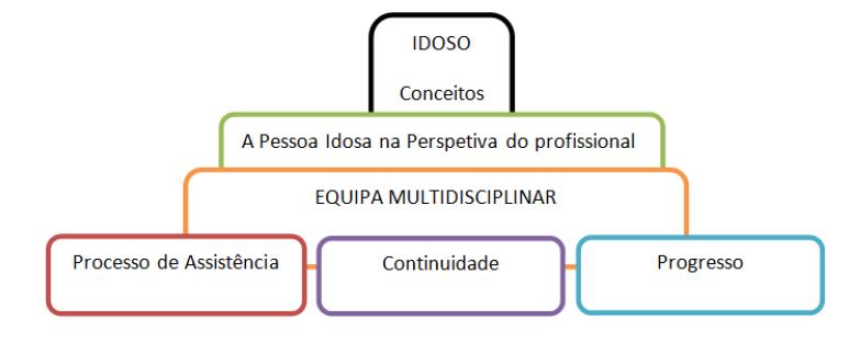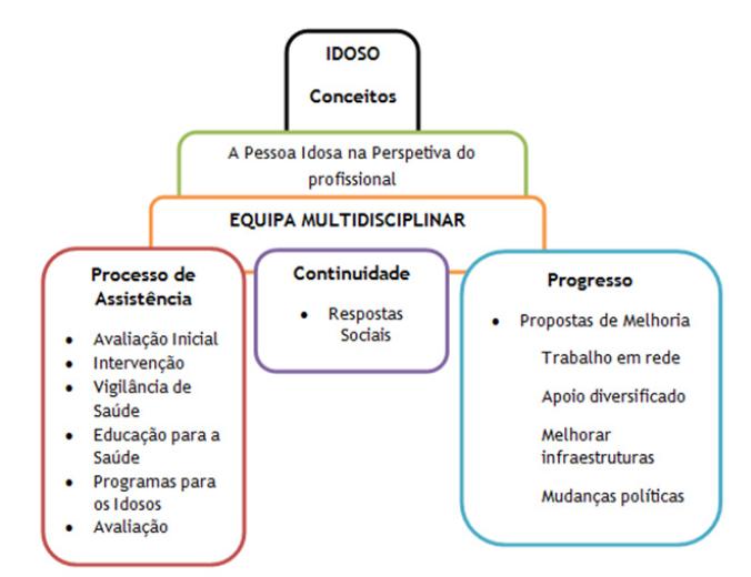 Procurou-se através da análise de conteúdo das entrevistas descobrir significados e agrupar a informação obtida, a qual possibilitou identificar as temáticas. A Figura I reflete o espelho de um modelo que desenvolvido será útil para o trabalho interdisciplinar e organização dos cuidados com vista à promoção de um envelhecimento ativo, sendo apresentado por temáticas que surgiram das categorias emergentes. A partir das áreas temáticas apresentadas na seguinte Figura I serão referidas as categorias e subcategorias e respetivas unidades de registo, e discutida a informação conseguida. Assim sendo nas próximas figuras será percetível as categorias identificadas em relação à pessoa idosa na perspetiva do profissional que norteará o trabalho da equipa multidisciplinar e as categorias relacionadas com o processo de assistência, tais como avaliação inicial, intervenção e educação para a saúde, sendo de valorizar também a necessidade de vigilância programada e os programas para os idosos definidos de acordo com as necessidades da população alvo.
