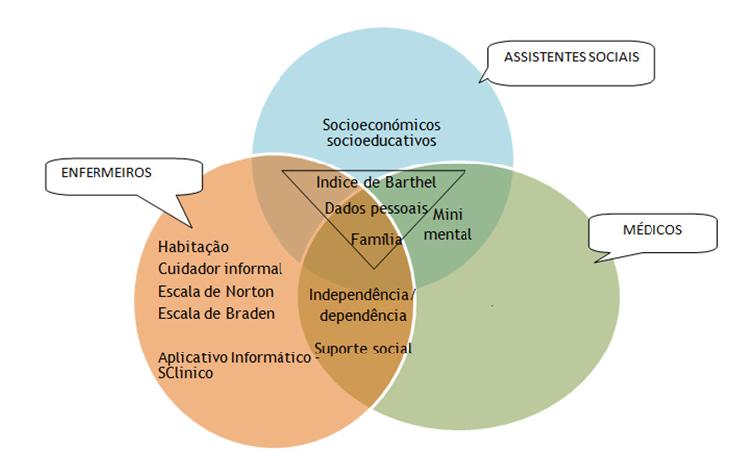 Pela análise, pode-se concluir que todas as classes de profissionais, incluindo Assistentes Sociais, Enfermeiros e Médicos fazem a avaliação inicial do idoso tendo por base dados específicos de avaliação e instrumentos validados/escalas, emergindo estas duas categorias, sendo que os Enfermeiros valorizam também os sistemas de informação.