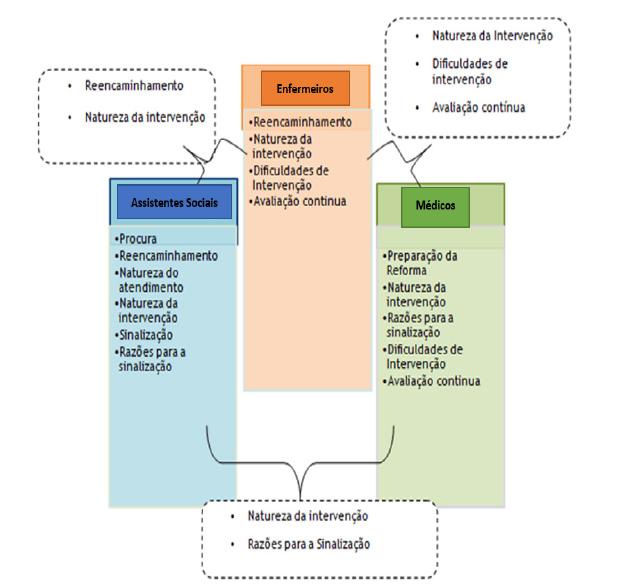 Outra temática que foi relatada pelos profissionais foi a intervenção dos três profissionais envolvidos, tendo sido identificadas as categorias procura, natureza do atendimento, natureza da intervenção, reencaminhamento, razões de sinalização, dificuldades de intervenção e avaliação contínua. Na natureza de intervenção foi evidenciado a importância da reabilitação.