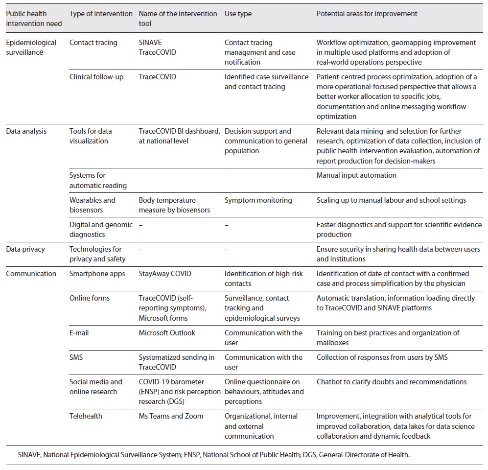 In August 2020, Nature Medicine published an article about technological maturity and digital responses in the context of the COVID-19 pandemic 6. There is a granularity in national management and local challenges in technology adoption. Given the scarcity of information and investigations on the topic, a qualitative methodology was considered more appropriate. The research involved a literature and operational practices review across different contexts and services as well as expert’s opinions to systematize a contextualization of the technologies adopted in Portugal in the current crisis. Likewise, we provide an overview of collected data while highlighting aspects of possible improvements. Through a comparative data analysis approach, we identify 4 major areas in need of public intervention (epidemiological surveillance, data analysis, data privacy and communication). We, then, subset the type of intervention and the adopted tool in Portugal for this purpose during the pandemic. Further details are described in Table 1, as well as the identified areas of improvement.
