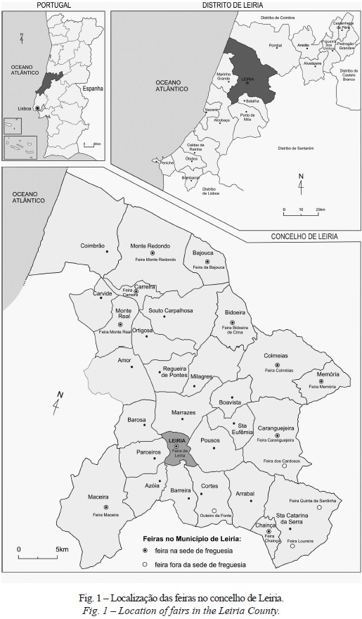 A feira de Leiria foi criada em 1295 (anais do Município de Leiria: 15) pelo rei D. Dinis, ao mesmo tempo em que as de Vila Flor, Alvito, Sernancelhe e outras. Conforme documentos da Câmara Municipal de Leiria e entrevista junto ao departamento de feiras e mercados, realizam-se atualmente no concelho, além das feiras anuais, 15 feiras semanais, representadas a seguir (fig. 1).