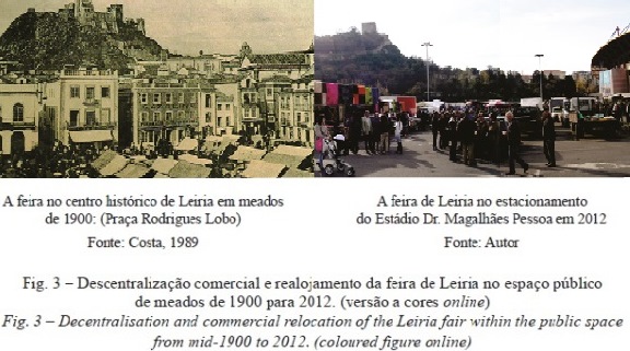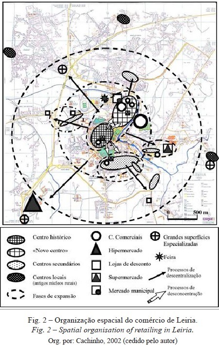 Em Leiria, verifica-se a descentralização comercial (fig. 2) e desvitalização do centro histórico (Cachinho, 2002). A periferização da centralidade urbana, com a presença de supermercados, hipermercados, shopping centres e, entre outros, a própria feira de Leiria, reforça os interesses dos grupos empresariais, que se ajustam incessantemente sobre o espaço comercial urbano, garantindo grande diversidade de produtos no mesmo lugar, além de outras facilidades de comercialização (Pintaudi, 1999: 155). Conforme Singer (1997: 15-17),