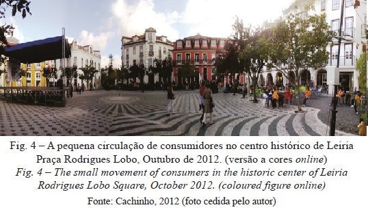 Lembra Jesus (2009) que, à concepção dominante de ordem segregadora e funcionalista circulatória da rua, se opõe o uso das camadas populares, que promovem outro sentido e significado ao espaço público. Com o aparecimento e intensificação do automóvel, o centro histórico de Leiria perdeu espaço de sociabilidade e de consumo (fig. 4).