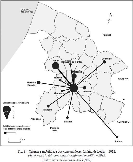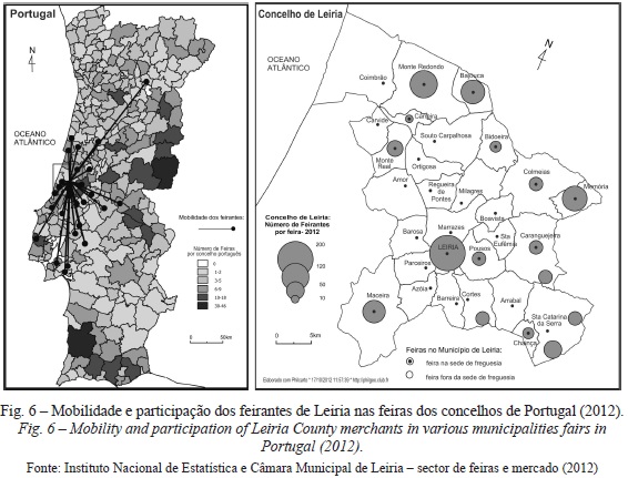 Inversamente às tendências comerciais globais, a feira de Leiria desenvolve funções de sociabilidade, de identidade, de identificação com o lugar e de centralidade temporária, oportunizando também troca de informações através das frequentes mobilidades de feirantes e consumidores (fig. 5). Assim, dentro do sistema de feiras, ela se torna um nó relevante como centralidade temporária na rede de comércio do município e da região, auxiliando e controlando todo um processo de produção de capital, a partir das necessidades e condições que se encontram no cotidiano dessas pessoas. Nesse sentido, esta feira representa referência na oferta de alimentos e de outras mercadorias, promovendo fluxos de feirantes entre diversas cidades da área de influência de Leiria.