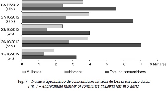 Como se pode verificar pela figura 7, entre os dias 15 de Outubro e 3 de Novembro de 2012, a feira do sábado é a que atrai mais consumidores, ultrapassando seguramente os 5 000 frequentadores. As mulheres são a maioria, cerca de 60%, e se interessam principalmente por artigos de vestuário e calçado.