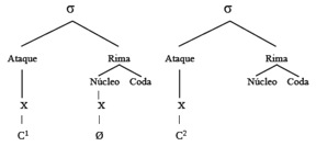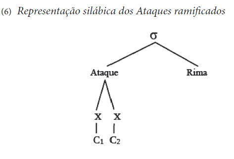 O quadro retirado de Veloso (2003, 2006) e apresentado em (1), na introdução deste artigo, sintetiza as propriedades que distinguem os Ataques ramificados e os grupos consonânticos problemáticos. De acordo com Mateus e d’Andrade (2000), por serem as únicas sequências de consoantes em que são respeitados o Princípio de Sonoridade e a Condição de Dissemelhança, as combinatórias de tipo obstruinte+líquida são, no PE, as únicas sequências consonânticas que podem verdadeiramente ser consideradas como realizações de um Ataque ramificado. Todas as outras combinatórias consonânticas são, assim, excluídas da possibilidade de fazerem parte das sequências admissíveis no domínio deste constituinte silábico. Deste modo, não sendo aceites como Ataques ramificados, essas mesmas sequências são entendidas, de acordo com a análise fonológica proposta pelos autores, como sendo constituídas por consoantes heterossilábicas, pertencendo os dois segmentos da sequência a dois Ataques não ramificados distintos, no domínio de nós silábicos adjacentes: no caso dos grupos consonânticos problemáticos, a primeira consoante é considerada como Ataque não ramificado de uma sílaba com Núcleo vazio e a segunda como Ataque não ramificado da sílaba adjacente à direita (Mateus & d’Andrade, 2000). Em (6) e (7), são representadas as estruturas silábicas propostas para os Ataques ramificados e para os grupos consonânticos problemáticos, respetivamente: