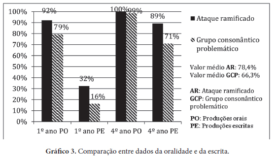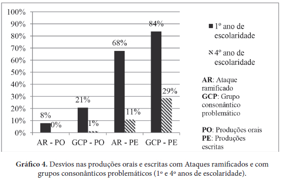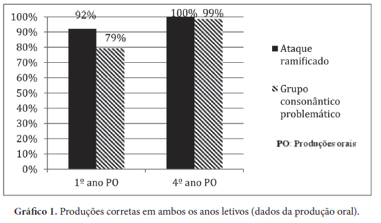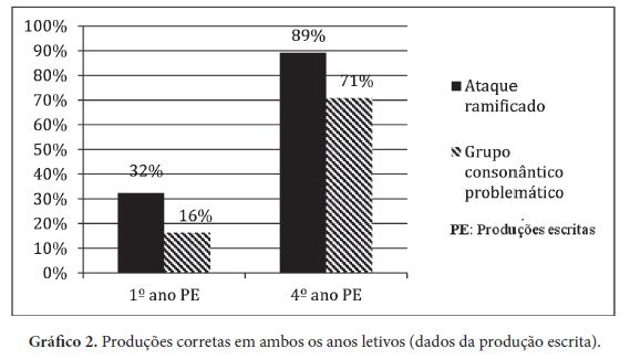 Existe uma acentuada assimetria entre os resultados obtidos para os 1º e 4º anos: contrariamente ao 1º ano, o 4º ano apresenta um valor elevado de sucesso no registo escrito de Ataques ramificados (89,2%); no caso dos grupos consonânticos problemáticos, a taxa de sucesso média (70,9%) é inferior. Se aplicarmos a escala de Hernandorena (1990) aos dados da ortografia aqui descritos, apuramos que a primeira estrutura se encontra aprendida e estabilizada no 4º ano, estando a segunda ainda em processo de aprendizagem.[1]