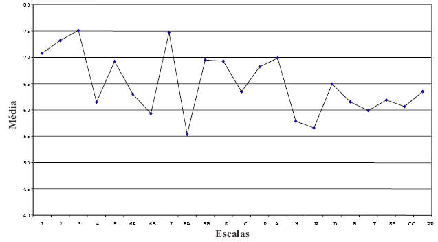 Na Figura 1 temos a representação gráfica da Como se pode verificar, a frequência máxima pontuação média por escala.