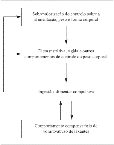 Este “quebrar das regras alimentares” é frequentemente apontado pelos sujeitos como um dos factores desencadeantes dos episódios de ingestão alimentar compulsiva (Fairburn, Cooper, & Cooper, 1986; Fairburn, Cooper, & Shafran, 2003). O ciclo é, assim, perpetuado, sendo que a ingestão alimentar compulsiva é normalmente seguida de sentimentos de culpa e angústia pela perda de controlo e pelos efeitos temidos da ingestão exagerada no peso e forma corporal, ampliando a preocupação com estes aspectos. O recurso a métodos compensatórios, como o vómito, surge como forma de controlar os efeitos da ingestão alimentar e de trazer alívio aos sujeitos, interrompendo temporariamente o desconforto e a ansiedade provocados pela ingestão exagerada. No entanto, estes mecanismos compensatórios deixam os sujeitos mais vulneráveis para a ocorrência de um novo episódio de descontrolo alimentar. Este ciclo favorece a procura de novas tentativas de controlo do peso e aumenta a rigidez das regras alimentares, intensificando e mantendo assim as preocupações com o peso e controlo alimentar, num ciclo caracterizado pela restrição-compulsão alimentar.
