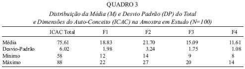 Quanto ao auto-conceito total, verifica-se um valor médio de 75.61 (DP=6.02; mín.-máx.=5888) (ver Quadro 3) que segundo Vaz Serra (1986) se pode considerar dentro dos valores médios para a população normal (70.4±7.8).