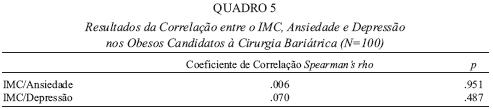 Para analisar a relação entre a ansiedade, depressão e o auto-conceito, variáveis com distribuição não paramétrica, utilizamos o coeficiente de correlação de Spearman (ver Quadro 4). Os resultados demonstram que a ansiedade se encontra significativa e negativamente relacionada com o autoconceito (r=-.372, p<.001) e que a depressão se correlaciona significativa e negativamente com o auto-conceito (r=-.439, p<.001). Neste sentido, os valores encontrados sugerem que menores níveis de ansiedade e depressão relacionam-se com um auto-conceito mais elevado em obesos candidatos à cirurgia bariátrica. No Quadro 5 (ver Quadro 5) verificamos que o teste de Spearman’s rho para verificarmos a associação entre o IMC e os níveis de ansiedade e depressão revelou que não se verifica uma correlação estatisticamente significativa entre o IMC e os níveis de ansiedade (r=.006, p=.951) e depressão (r=070, p=.487). Portanto, não se pode verificar a associação proposta de que um elevado IMC corresponde a elevados níveis de ansiedade e depressão.