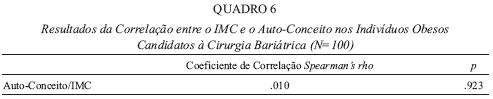 A análise realizada através do coeficiente de correlação de Spearman’s rho para avaliar a possível relação entre as variáveis IMC e o auto-conceito demonstram que o IMC não se correlaciona significativa e negativamente com o auto-conceito (r=.010, p=.923), ou seja, podemos verificar que os níveis de auto-conceito dos utentes com obesidade mórbida não estão significativa e negativamente correlacionados com os seus valores de IMC (ver Quadro 6).