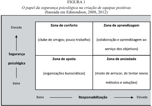 Importa notar que a segurança psicológica não é, per se, suficiente para a aprendizagem e o sucesso. Antes requer a companhia dos sentidos de responsabilidade e de responsabilização pela prossecução dos objetivos (Edmondson, 2012). Quando a segurança psicológica e a responsabilização dos colaboradores são pobres, a equipa opera sob a zona da apatia (Figura 1). As pessoas preocupam-se, acima de tudo, em manter o seu trabalho, fazendo favores a quem está em posições de poder. Neste contexto, a troca de ideias e a aprendizagem são mínimas. Quando a segurança psicológica é baixa mas a responsabilização é elevada, a equipa opera na zona da ansiedade. As pessoas receiam apresentar ideias, experimentar novas perspetivas ou mesmo pedir ajuda aos colegas. A troca de ideias e a aprendizagem são reduzidas. Quando a segurança psicológica é elevada mas a responsabilização reduzida, a equipa ingressa na zona de conforto. As pessoas apreciam o local de trabalho e os colegas, mas a equipa não se sente particularmente desafiada nem empenhada na aprendizagem e na prossecução dos objetivos. Por último, quando a segurança psicológica e a responsabilização são elevadas, a equipa opera na zona de aprendizagem. As pessoas sentem que o seu trabalho é desafiante e que têm espaço para discutir e apresentar ideias. O foco centra-se na colaboração entre colegas com o objetivo de aprender mais.