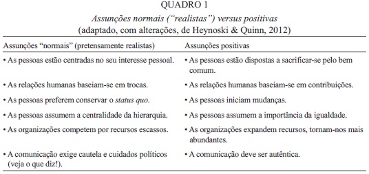 As consequências não se ficam por aqui: o modo de ação tenderá a confirmar as expectativas iniciais (Merton, 1948). Ou seja, os efeitos gerados pela teoria/premissa podem acabar por “comprovar” a teoria. Se um gestor perfilha uma teoria pretensamente realista que encara os humanos como entidades exclusivamente individualistas, é provável que crie espaços organizacionais dominados pelo individualismo feroz e a competição dura. Por conseguinte, gestores “realistas” criarão contextos “realistas”. Diferentemente, gestores com assunções positivas e focalizados nas forças dos colaboradores tenderão a criar condições para fazer florescer contextos organizacionais positivos. Eis a norma da reciprocidade, tal como explicada por Jerry Greenfield, o Jerry da Ben e Jerry’s, “Ben diria que se trata de uma lei espiritual: aquilo que dás é aquilo que recebes” (in Lucas, 2012, p. 10). Em suma: o realismo das assunções de partida de muitos líderes limita a capacidade de desenvolver boas teorias de gestão. O Quadro 1, adaptado de Heynoski e Quinn (2012), contrasta assunções positivas e “normais”.